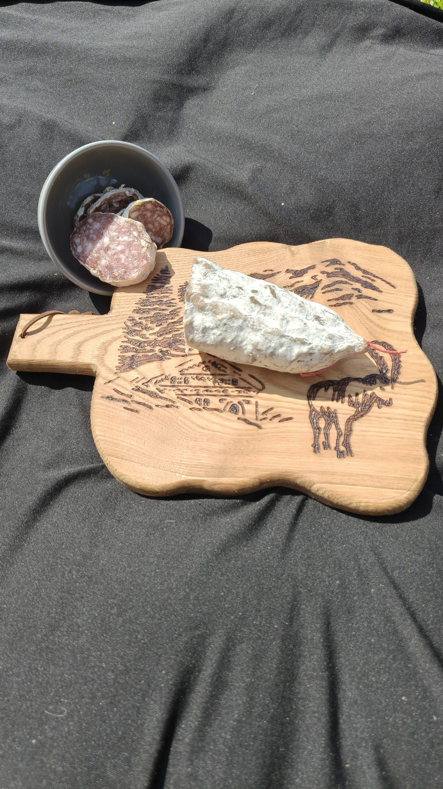 👉🏻 Utilité : Cette planche pourra autant vous servir à l’apéro entre amis ou famille, en posant du fromage ou de la charcuterie. En centre de table, elle saura accueillir vos plats chauds sans se soucier de lui laisser une marque noire. Pour finir, en cuisine, utilisez-la en planche à découper. Privilégiez une utilisation au verso afin de préserver le dessin. Le nettoyage est simplifié grâce à l’application de l’huile de lin en finition, un coup d’éponge et de l’eau suffira pour qu’elle soit de nouveau prêt à être utilisé.