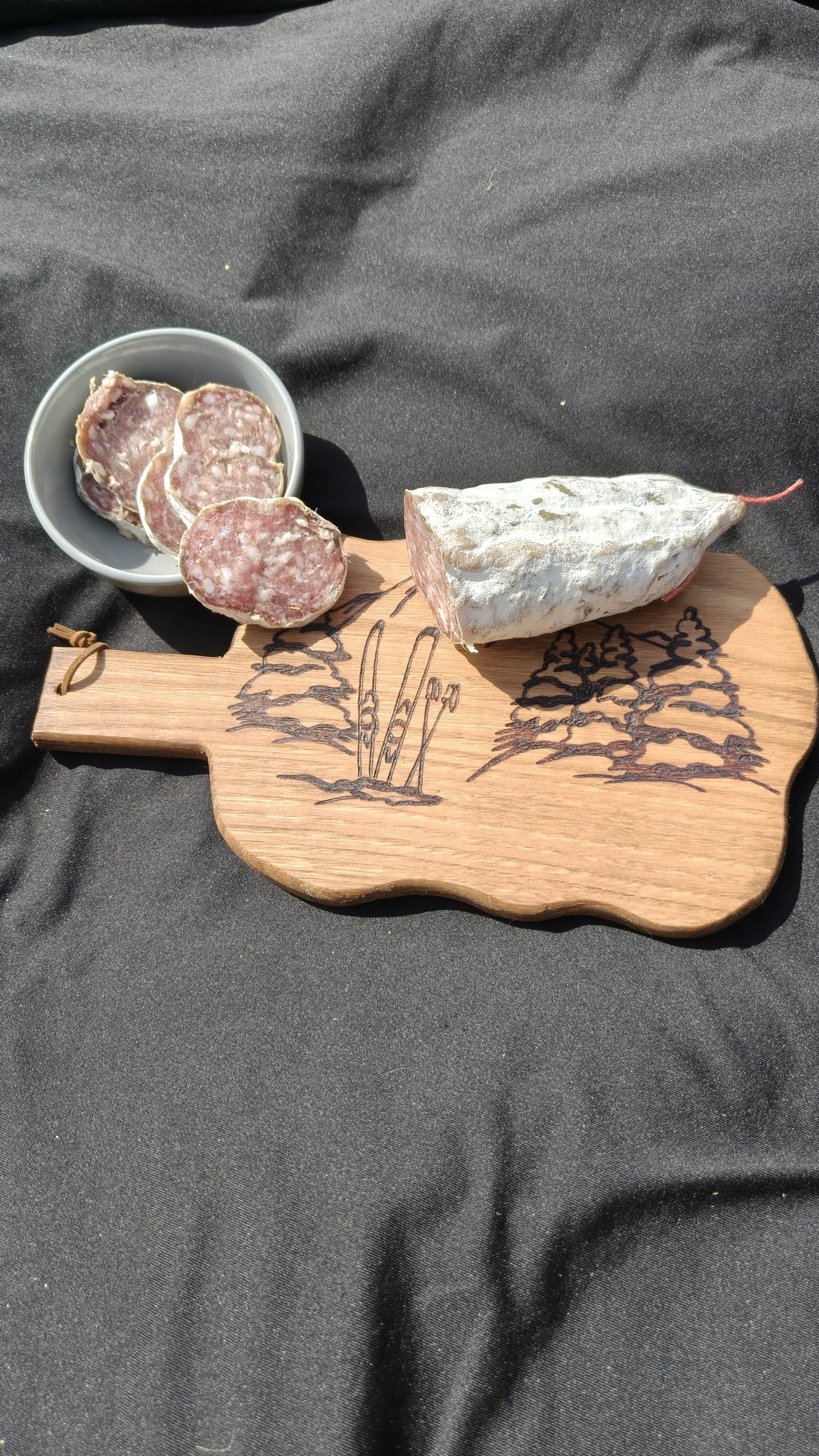 👉🏻 Utilité : Cette planche pourra autant vous servir à l’apéro entre amis ou famille, en posant du fromage ou de la charcuterie. En centre de table, elle saura accueillir vos plats chauds sans se soucier de lui laisser une marque noire. Pour finir, en cuisine, utilisez-la en planche à découper. Privilégiez une utilisation au verso afin de préserver le dessin. Le nettoyage est simplifié grâce à l’application de l’huile de lin en finition, un coup d’éponge et de l’eau suffira pour qu’elle soit de nouveau prêt à être utilisé.